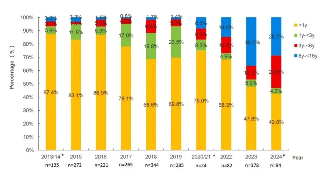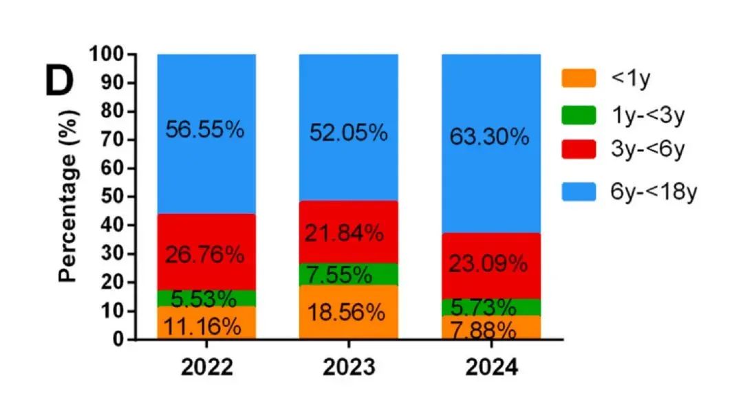 浙江大學醫學院附屬兒童醫院:從2022年至2024年,6-18歲患者人數大幅增加,占比最大(>52%)。
