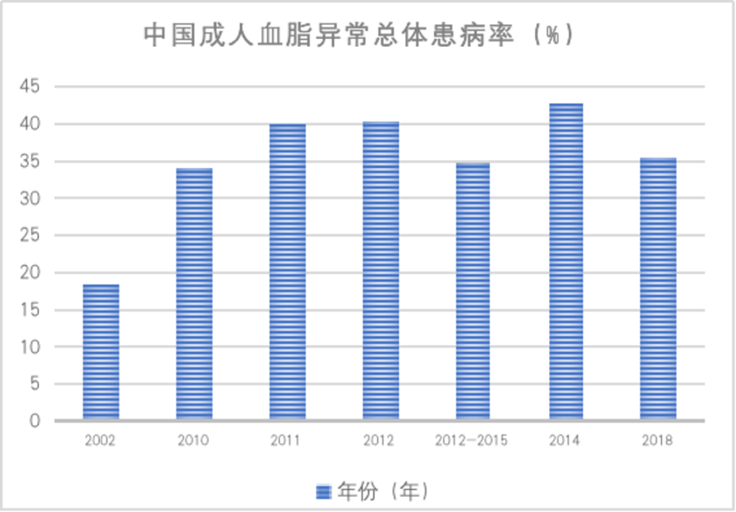 近幾十年來,中國人群的血脂水平、血脂異常患病率明顯增加,以高膽固醇血癥的增加最為明顯。2018年全國調查結果顯示,≥ 18歲成人血脂異常總患病率為 35.6%。